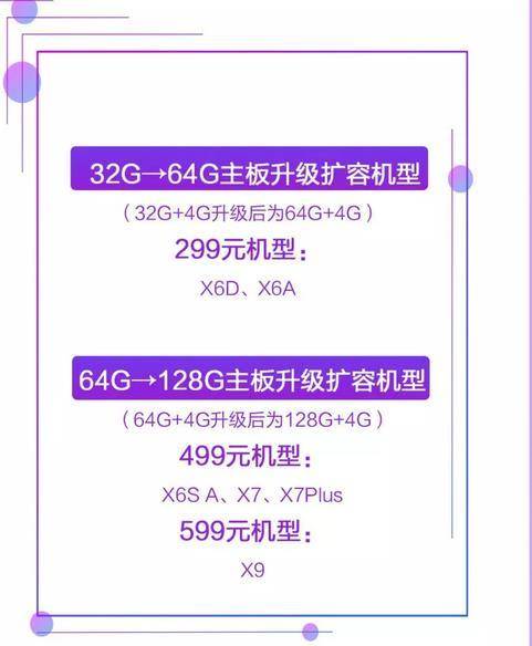 依据本次内存升级活动流程,vivo X6D、X6A、X6S A、X7、 X7Plus、X9机型都能够根据运行内存扩充升級,最大为扩充到128GB储存空间。
